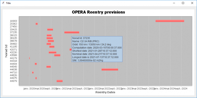 Moreover, only if the "Reentry date" filter has been activated, it will be possible to plot for all selected objects a "Gantt like" diagramm showing the reentry dates intervals. A tooltip will appera on each interval togive some specific informaiton as in the following figure.