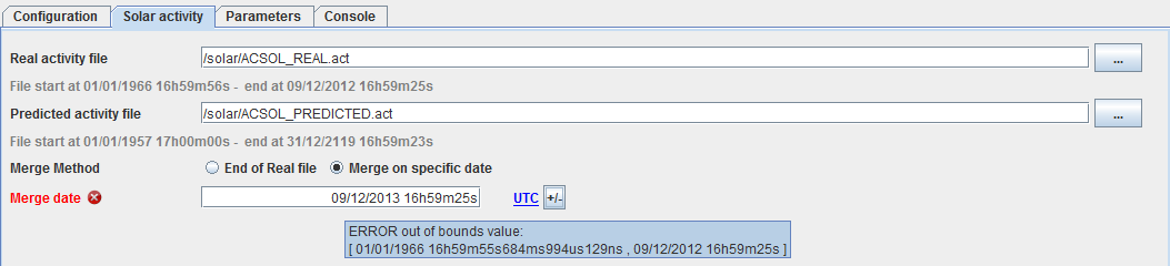 Once the solar activity files selected, the user may choose when OPERA will switch from a file to another one. By default, the merge will occur at the end of the actual data but it will be possible to change this date (with a value before the last date of course!).