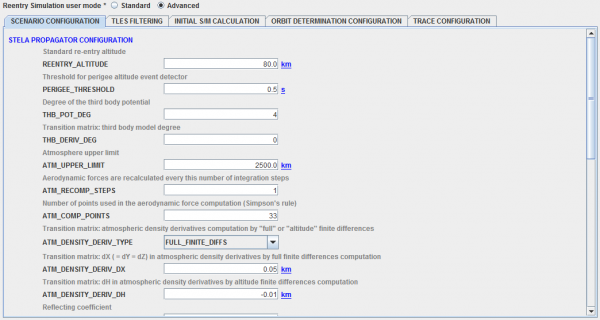 There are a great number of parameters to tune the OPERA computations depending on the previous chosen options ( | There are a great number of parameters to tune the <font color=#556B2F>'''OPERA'''</font> computations depending on the previous chosen options (reentry simulation, manoeuvers detection, ...). Originally, these parameters have been defined inside a properties file. IN <font color=#FF8C00 title="Graphical User Interface">GUI</font> mode, the content of such properties file is accessible with by default values read from a file included in the jar file. | ||
